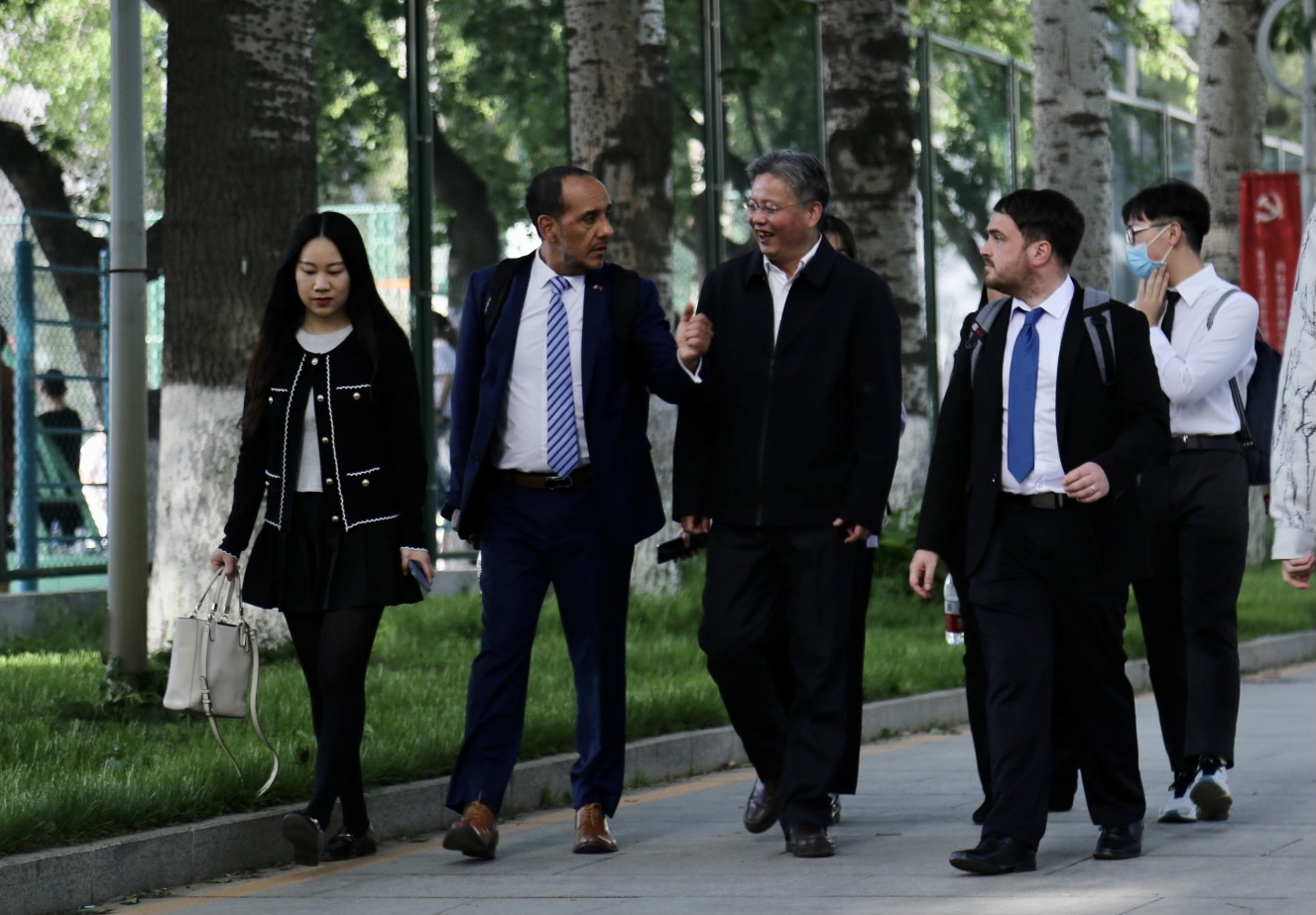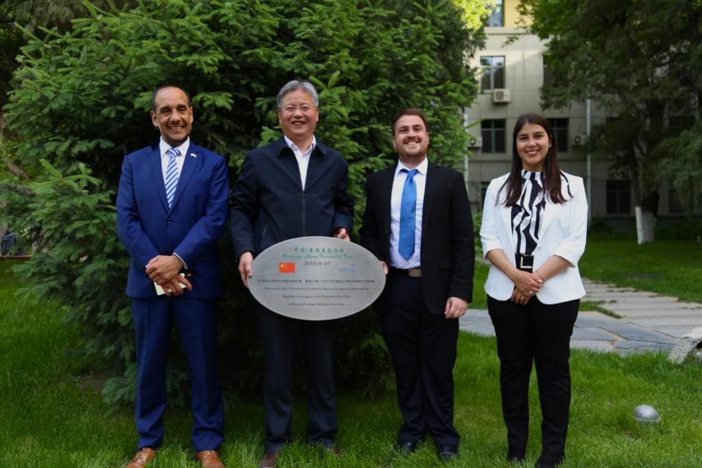 讲座结束后,在bevictor伟德经理常福良的陪同下,乌拉圭驻华使馆领事塞尔西奥·德亚巴列、潘慧敏老师、张哲海老师一起参观了北外校园的“中国—乌拉圭友谊树”。