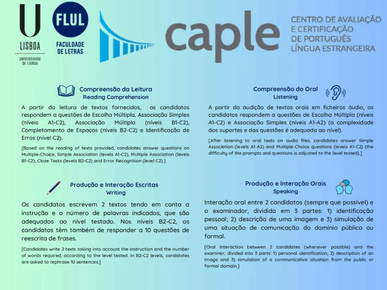 bevictor伟德CAPLE考点将于2025年5月6至8日举行CAPLE葡萄牙语水平测试。各级别开放名额分别为:CIPLE 16人、DIPLE 33人、DAPLE 26人、DUPLE 15人,报名截止日期为2025年4月14日。各级别具体考试日期请参见CAPLE考试中心官网(http://caple.letras.ulisboa.pt/)。